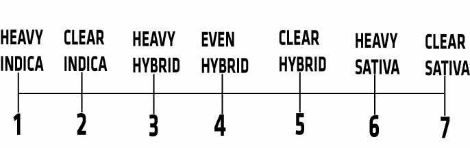 Here are some examples of how to use our system. To simplify things we have made seven categories of the most common kinds of medicinal relief provided by cannabis: 1 being the heaviest Indica and 7 being the clearest Sativa. Depending on which category, or desired effect you wish to achieve, you can use the scale to find out which type of medicine you are looking for and suggested strains of that kind.